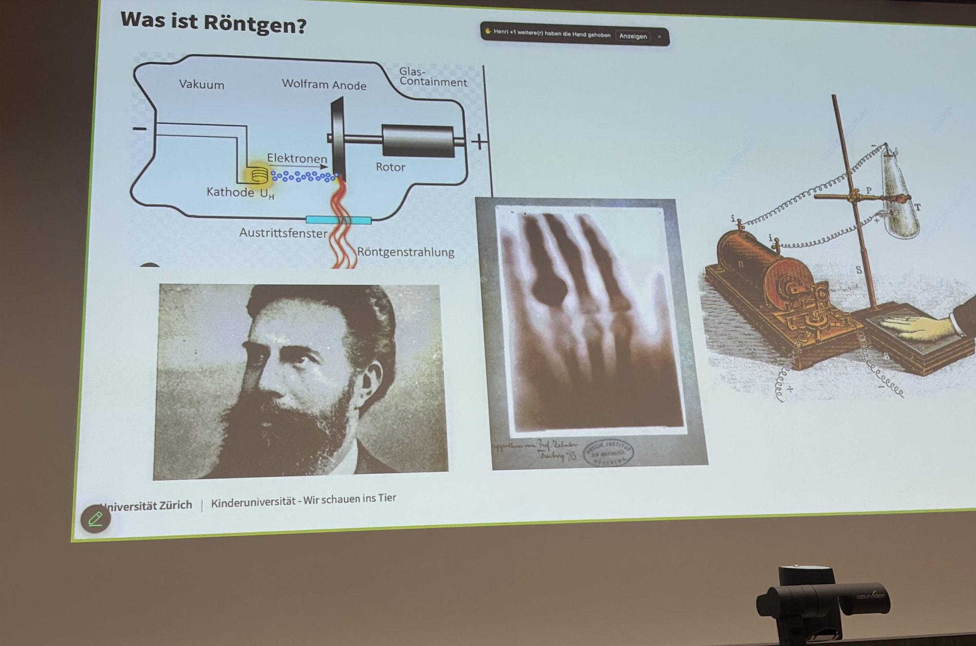 In der Vorlesung geht es um das Röntgen. Röntgen ist sehr gefährlich wegen der Strahlen! Es gibt verschiedene Arten von Röntgen wie zum Beispiel MRT und den Ultraschall. In der Klinik wird mit aussergewöhnlichen Tieren gearbeitet, wie zum Beispiel Gorillas, Eisbären, Tiger und rote Pandas. Sehr oft finden sie komische Sachen in den Bäuchen der Tiere wie Tennisbälle und Spielsachen. Viele Seeadler sind in Gefahr wegen der Bleikugeln mit den die Jäger auf Enten schiessen. Vor allem die Haustiere essen komische Sachen: jedes Jahr passiert es das circa 11 Hunde Grill Stäbchen im Bauch haben. Man kann eigentlich alles Röntgen!